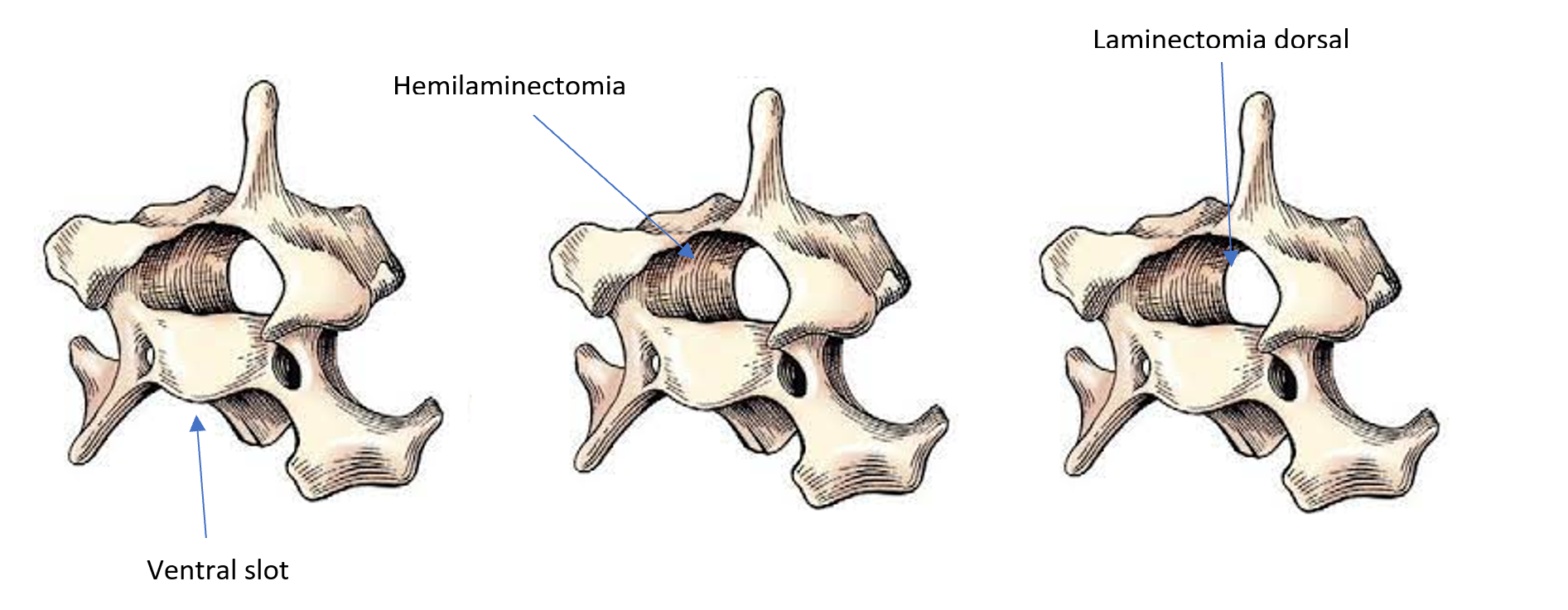 A diferença entre os procedimento de ventral slot, hemilaminectomia e laminectomia dorsal está na localização do acesso cirurgico realizado e na localização da janela criada.